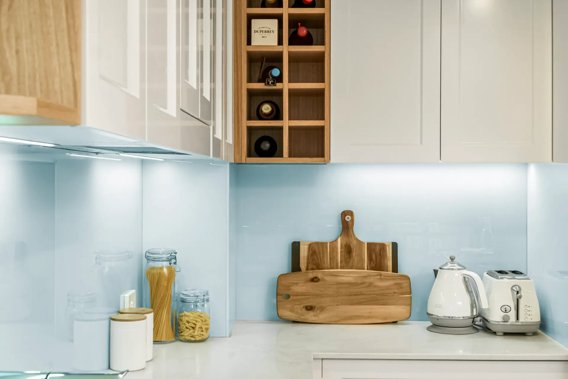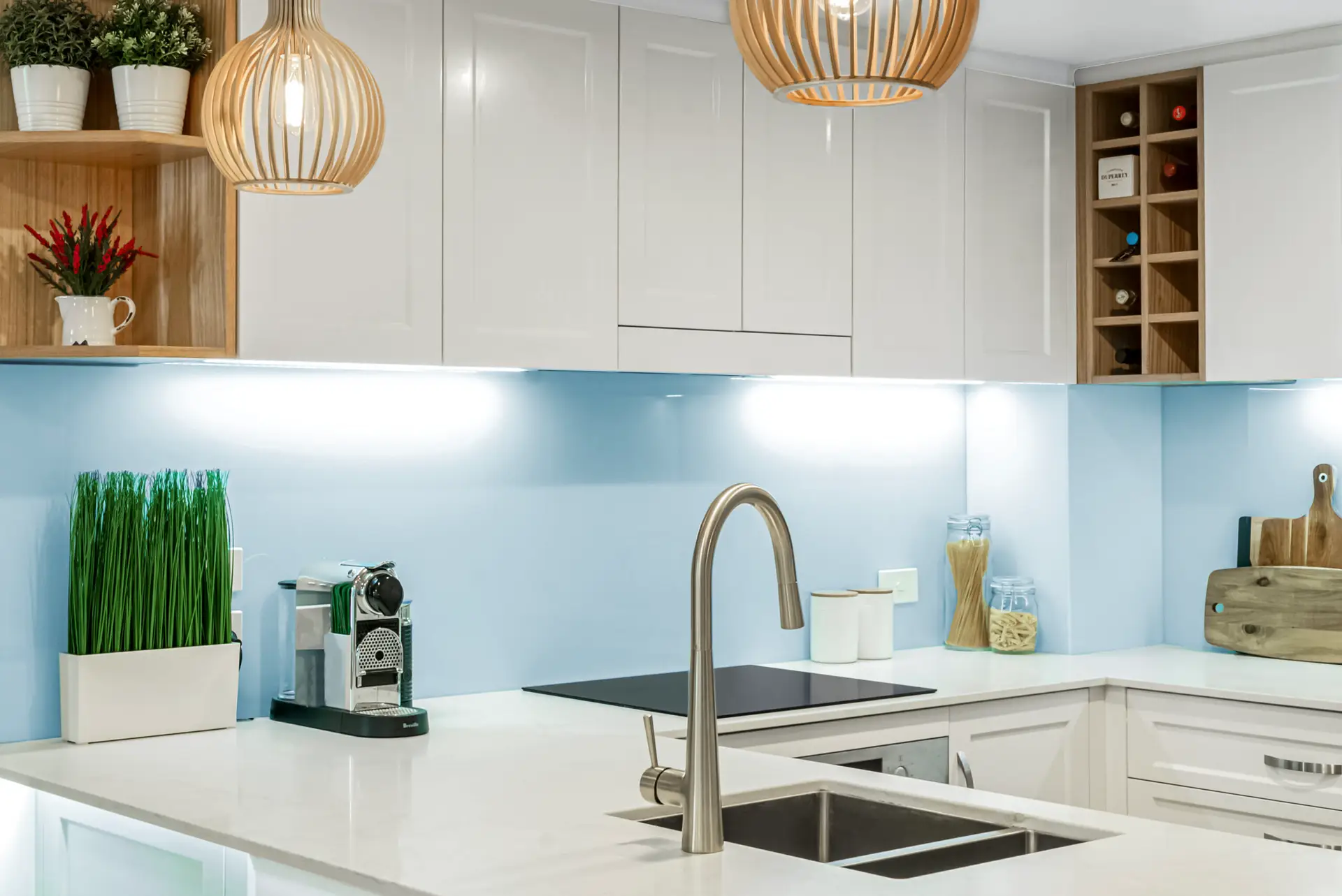 This kitchen features benchtops in YDL “Arctic White”, a Splashback in toughened blue glass, 2Pac cabinets with timber wine storage and shelves.